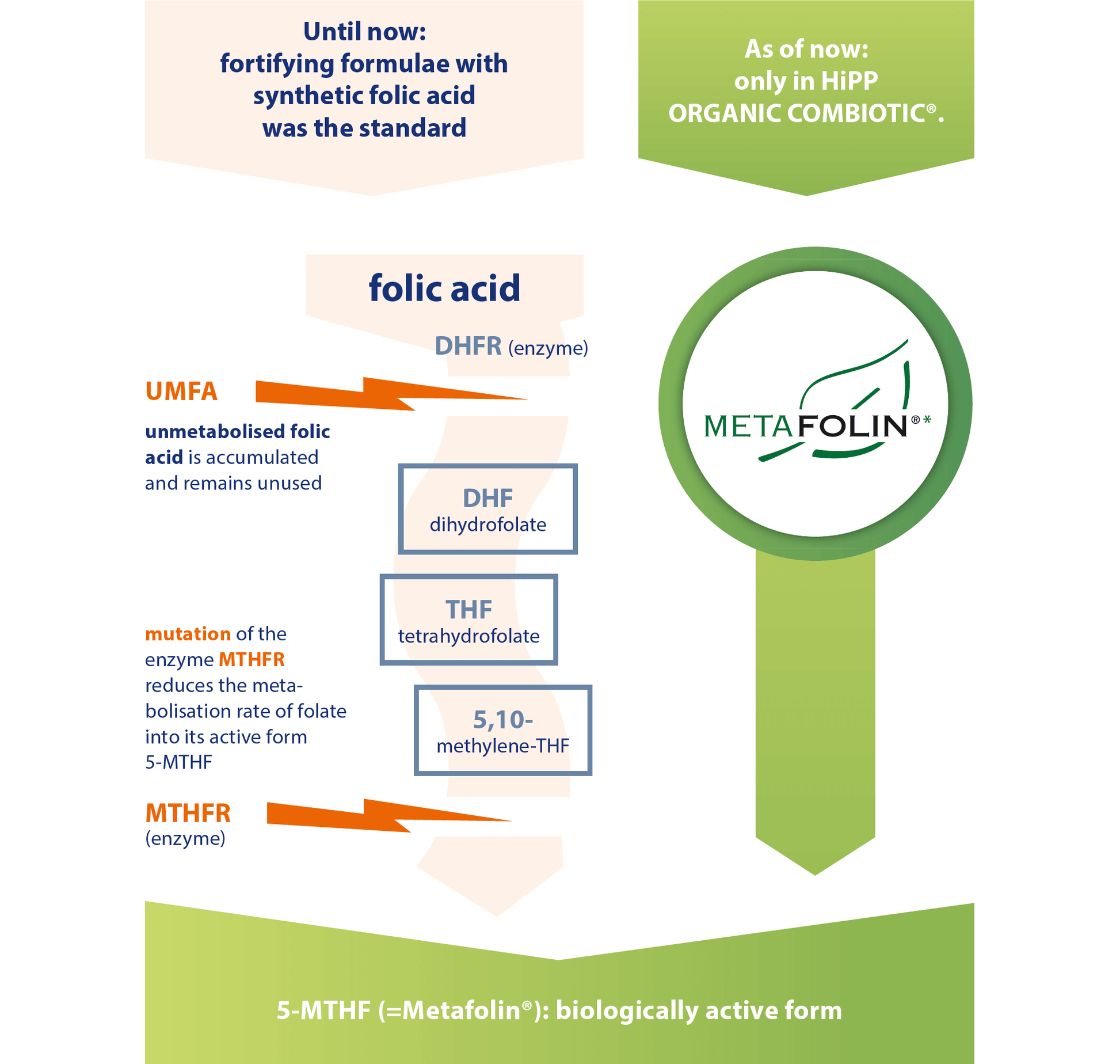 5-MTHF is the predominant form of naturally occurring folate in the blood. Unlike folic acid, it does not need to be converted or activated and exerts its effects immediately. Some people cannot convert sufficient amounts of the synthetic form of this B vitamin into its metabolically active form. The reason for this is a restricted or limited activity of individual enzymes. Up to now, synthetic folic acid has been prescribed by law as the standard for formulae. With breast milk, the infant receives 5-MTHF, the metabolically active form of folate. The logical next step is to also add a folate source to formulae that resembles that in breast milk: HiPP COMBIOTIC® with Metafolin® – one step closer to nature’s example.